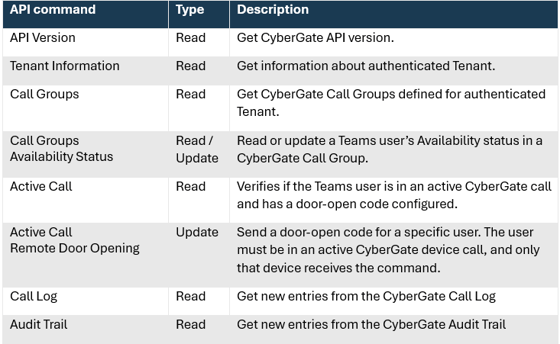 Use the CyberGate API to build custom dashboards that provide a near real-time event log of all Intercom calls, including date, time, call duration, call status (answered, missed, cancelled), which Teams user answered the Intercom call, and whether access was granted to the visitor.